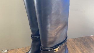 このブーツは、足首周りにアイコニックなゴールドのトリオンフロゴプレートがあしらわれたストラップが特徴です。 洗練されたシルエットとチャンキーなスタックドレザーヒールが組み合わされています。 今回はハーフソールを貼り […]